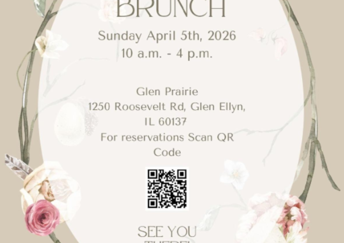 1 OF 1 EXPAND Easter Brunch 1250 Roosevelt Road, Glen Ellyn, IL 60137 (630) 613-1250 Dates: April 5, 2026 Location: Glen Prairie, Crowne Plaza Lombard Downers Grove, an IHG Hotel Time: 10:00 AM to 4:00 PM VISIT Website